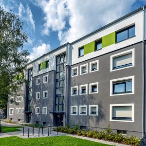 Die Dachgeschossaufbauten geben Raum für insgesamt acht neue Wohnungen, die – wie alle anderen – in kürzester Zeit vermietet waren. Über die kurze Modernisierungszeit von nur einem Jahr und über das schöne Ergebnis freuen sich Bewohner und DüBS!