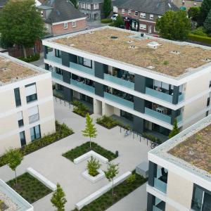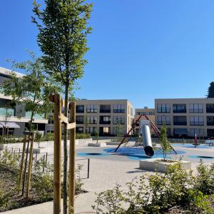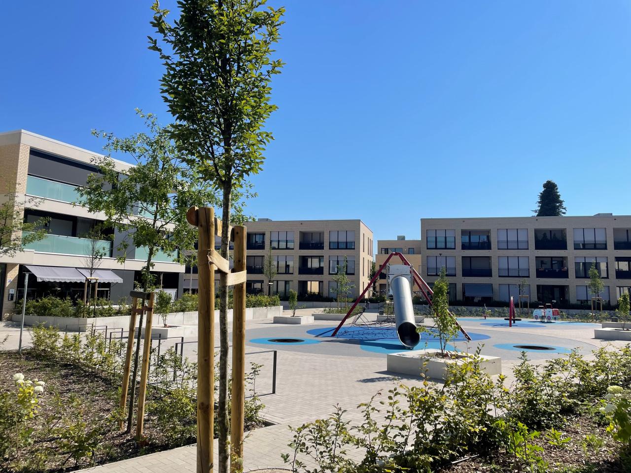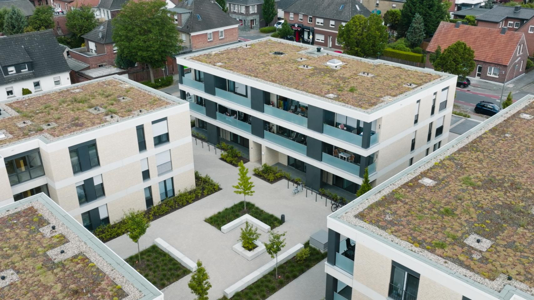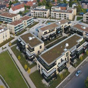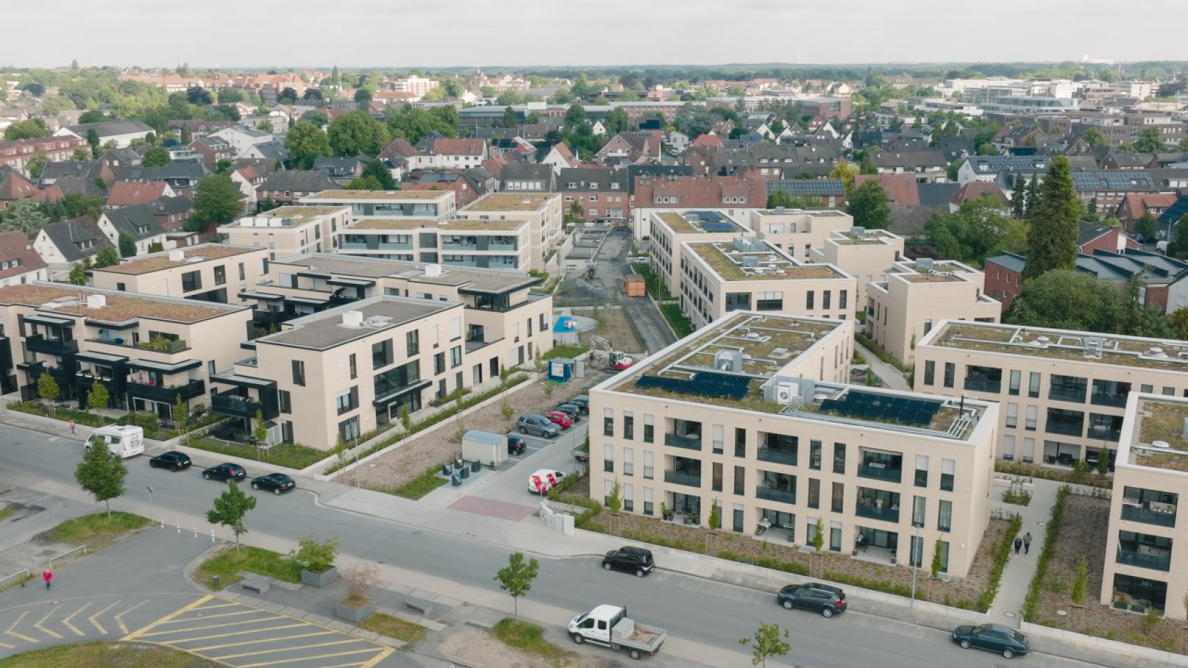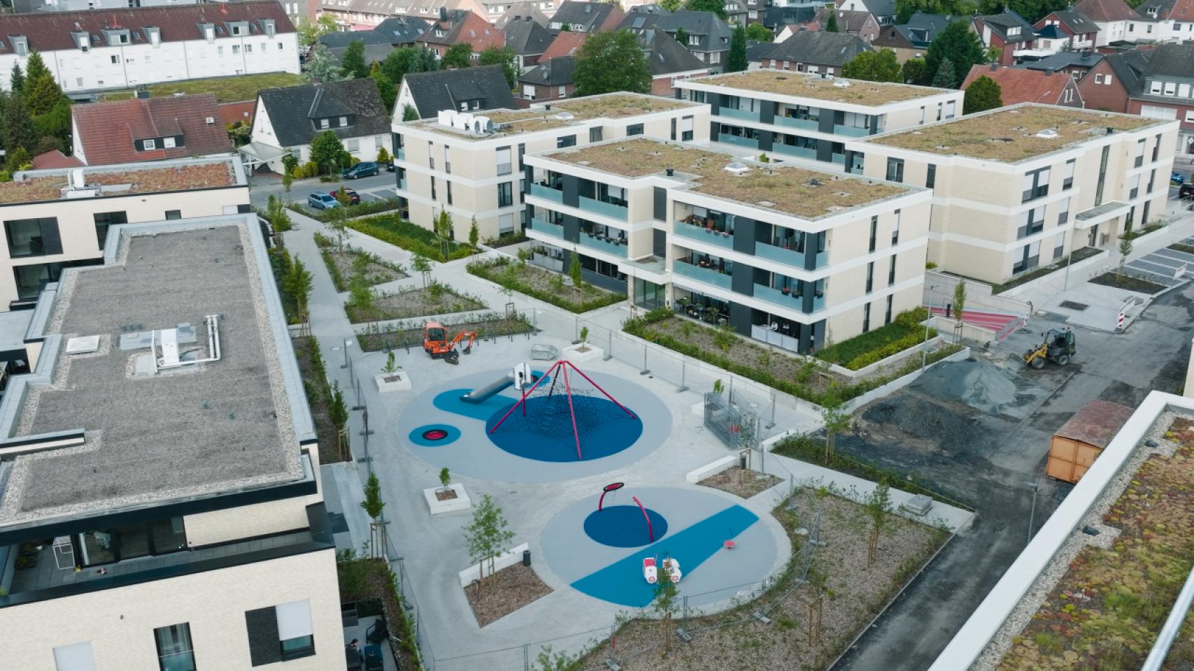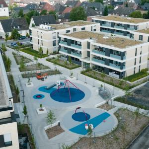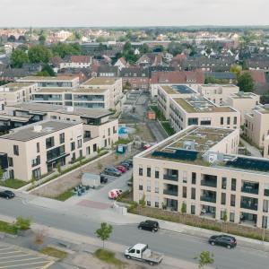 Mit Wohnen am Kirmesplatz realisieren wir 160 moderne Wohnungen, davon 110 gefördert. Die Neubauten sind barrierearm gestaltet, verfügen über Aufzüge und teilweise rollstuhlgerechte Einheiten. Nachhaltigkeit hat für uns höchste Priorität: KfW-55 Standard, Wärmepumpen, Dachbegrünung und großzügige Grünflächen sorgen für Energieeffizienz und Wohnqualität. Zusätzlich stehen Tiefgarage und Stellplätze für Komfort und Mobilität bereit. So entsteht ein attraktives, modernes Quartier in zentraler Lage von Rheine.